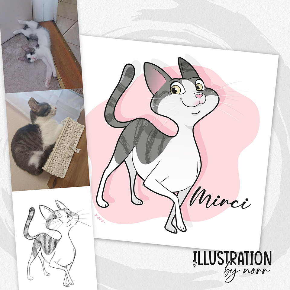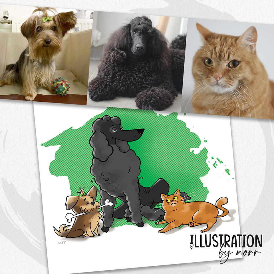 Háziállat megrajzolása esetén 3-4 fotót kérek a modellről. Szükségem lesz továbbá a nevére, nemére, esetleg a korára, valamint minden olyan extra információra a fizikai jellemzőit illetően, amelyekről tudnom kell és a képeken nem egyértelműek. Ha szeretnéd, hogy szerepeljen, akkor kedvenc játékáról is küldj fényképet. A folyamat során előfordulhat, hogy még további fotókat kérek.